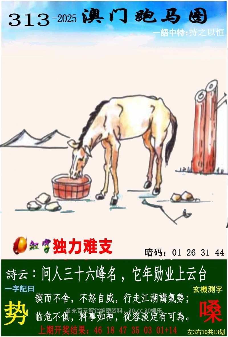 316期一字記曰:【渴】 生命之源,不能缺莫,力爭一瓢求解渴;求生本能,一定準確,象床玉手出新奇。【瑞】 解:沙恨无金尽日淘:尽日淘解日肖蛇马兔龙羊猴 综合取肖:蛇马兔龙羊猴 |