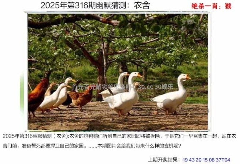 | 316期图片猜测(农舍) 农舍的鸡鸭鹅们听到自己的家园即将被拆除,于是它们一早召集在一起,站在农舍门前,准备誓死都要捍卫自己的家园。......本期图片会给我们带来什么样的玄机呢? 解:鸡解女肖兔蛇羊鸡猪幽默猜测综合取肖:猪鼠马蛇牛虎 |